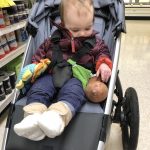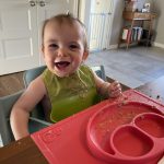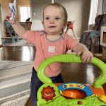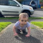 This month Mia found her vocal cords; she chats up a storm, can now scream, and that’s the end of our hearing. Her biggest feat has to be climbing up any and all stairs – sometimes to our surprise when we turn our backs for a moment and then find her halfway up them (yes, we’re getting better about closing gates). No walking yet, but she can get across the house at high speed leaning on a walker and we catch glimpses of her standing for short moments.